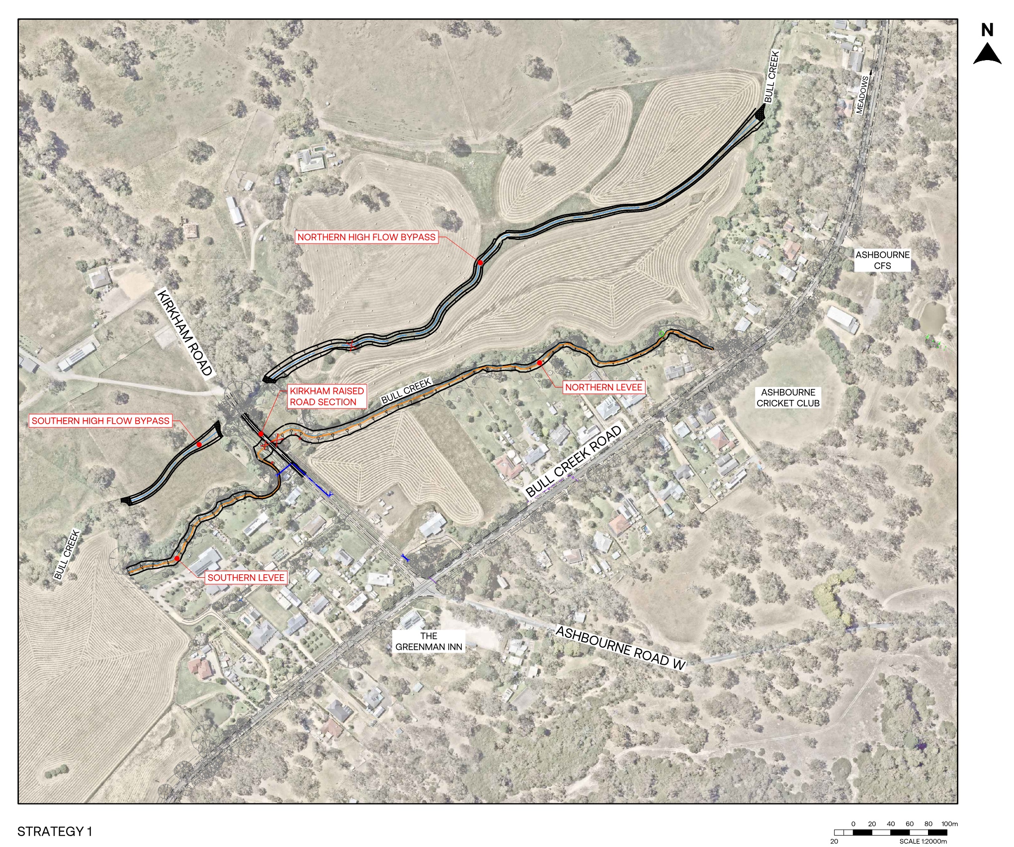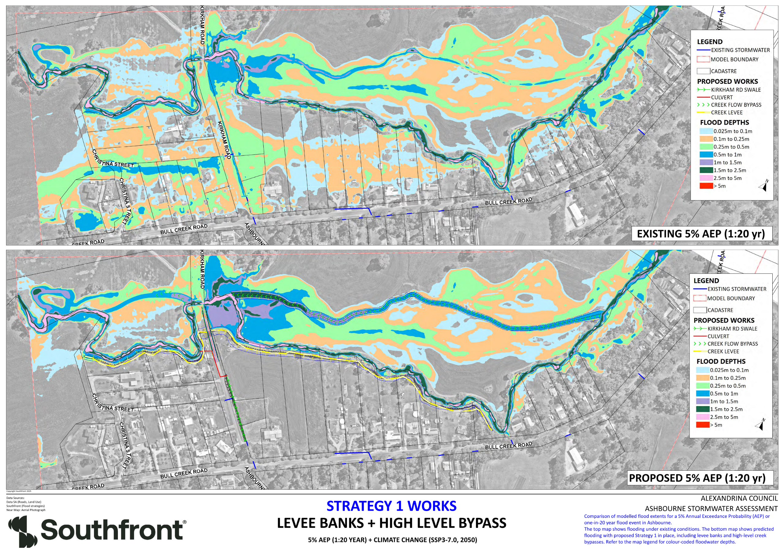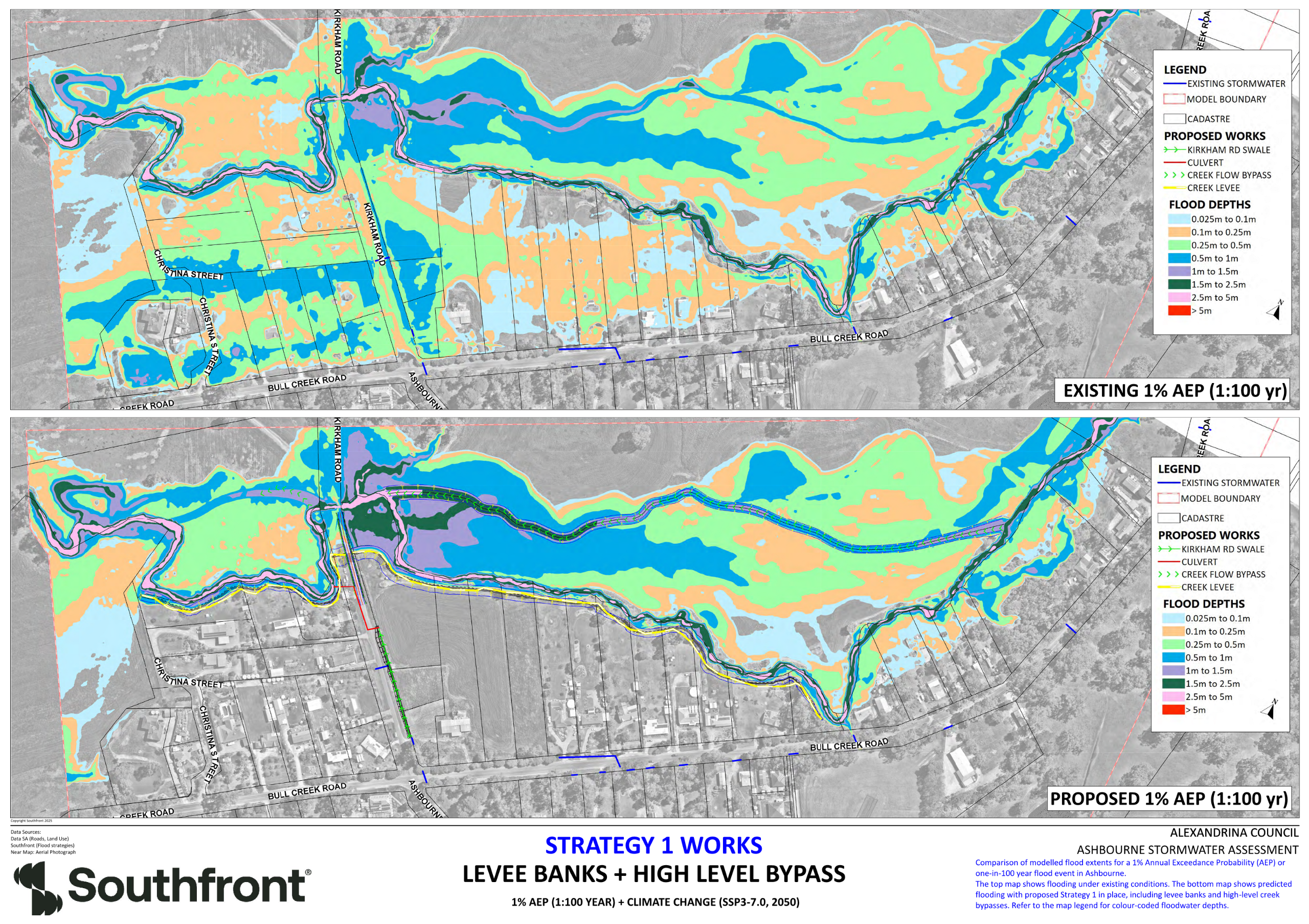 Manage Bull Creek stormwater to keep the water away from developed properties in the high risk flood prone areas. This includes Levee Banks on the East/South side of Bull Creek, High Level overflow paths and a raised section of Kirkham Road which is an integral part of the Levee bank system. This includes Levee Banks on the East/South side of Bull Creek, High Level overflow paths and a raised section of Kirkham Road which is an integral part of the Levee bank system.
