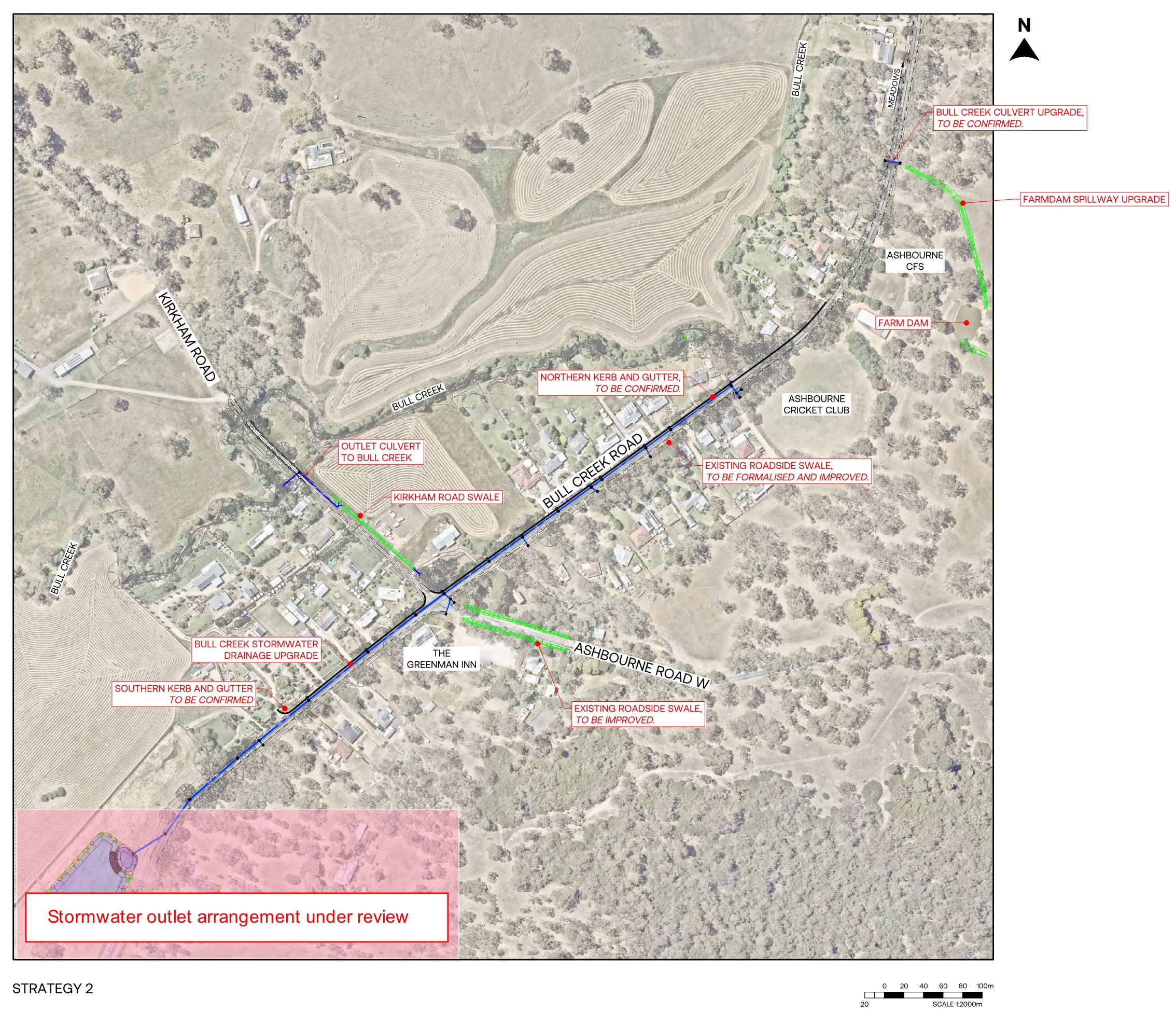 Collect and direct Bull Creek Road, Kirkham Road and Ashbourne Road West Stormwater through town via a dedicated stormwater pipe system. This will also include side of road stormwater collection improvements and an improved swale and pipe system along Kirkham Road.