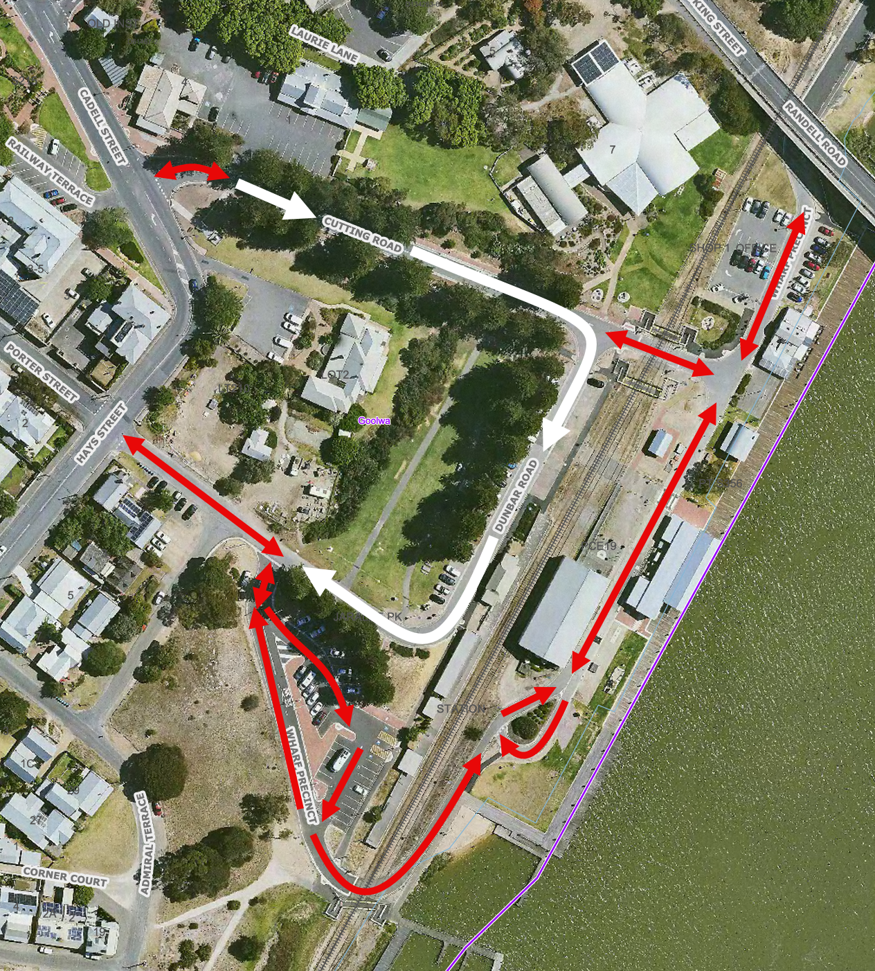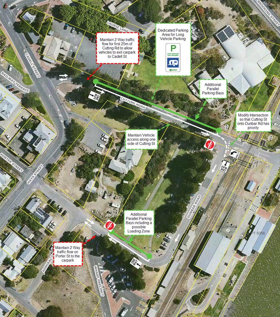 - Reconfiguring Cutting Road, Dunbar Road, and Porter Street into one-way streets within the Goolwa Wharf Precinct.